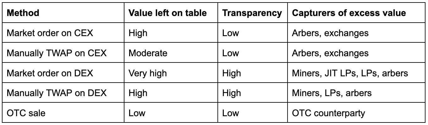 Suppose a DAO wants to sell $50m of its treasury token. It currently has a few options for execution: